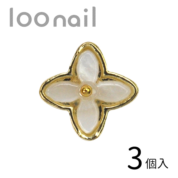 | フラワー(Flower) 「フェミニンなお花」 ゴールドのフレームの中にホワイトとピンクのシェル風ストーンを埋め込んでフラワージュエリーを仕立てました。 ふわっとフェミニンな印象で、ネイルアートの定番のフラワーアートに添えるパーツとして使いやすいですよ。 |